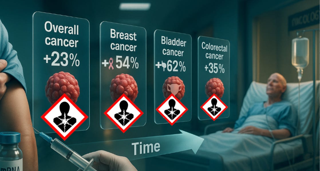 Official government data from nearly 300,000 people tracked for 30 months show mRNA shots significantly increase the risk of overall cancer, breast cancer, bladder cancer, and colorectal cancer.