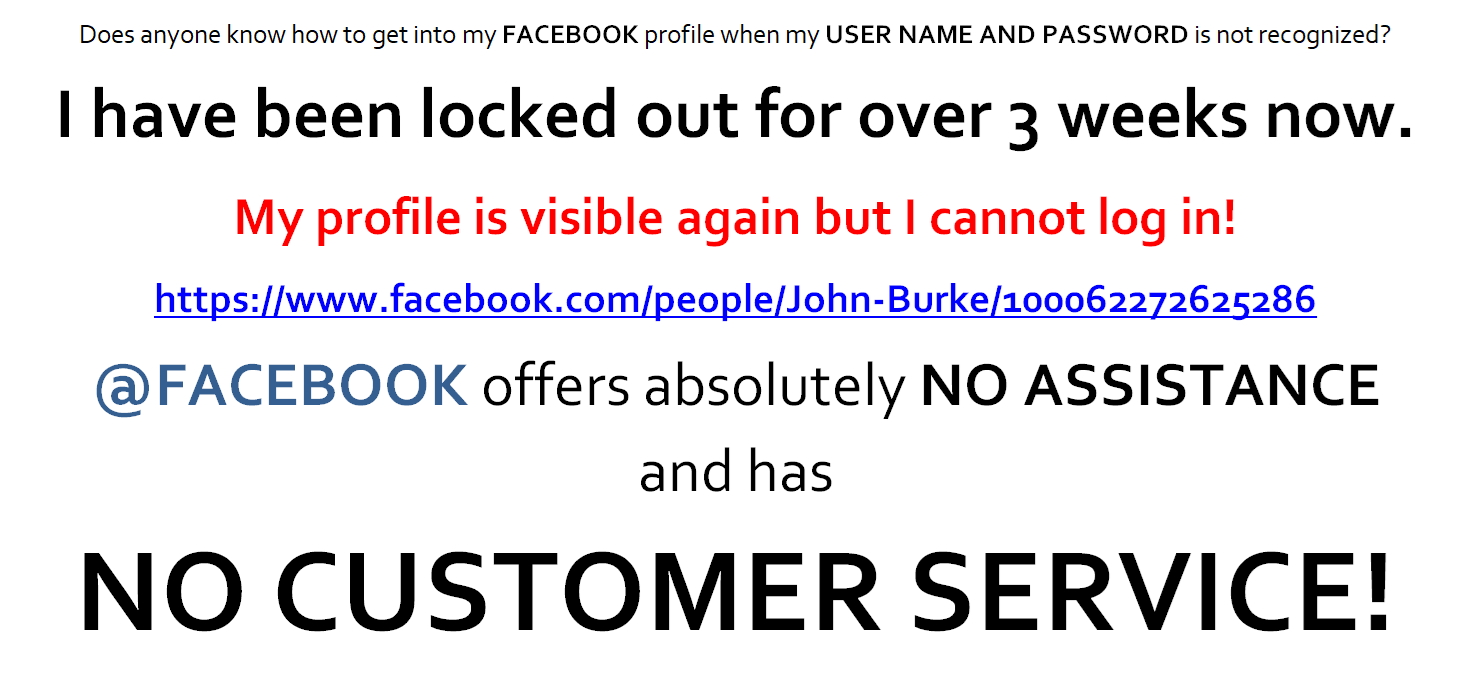 and has NO CUSTOMER SERVICE!Shared from a Facebook Friend: Does anyone know how to get into my FACEBOOK profile when my USER NAME AND PASSWORD is not recognized? I have been locked out for over 3 weeks now. My profile is visible again but I cannot log in! https://www.facebook.com/people/John-Burke/100062272625286 @FACEBOOK offers absolutely NO ASSISTANCE and has NO CUSTOMER SERVICE!0 Comments 0 Shares 368 Views 0 Reviews